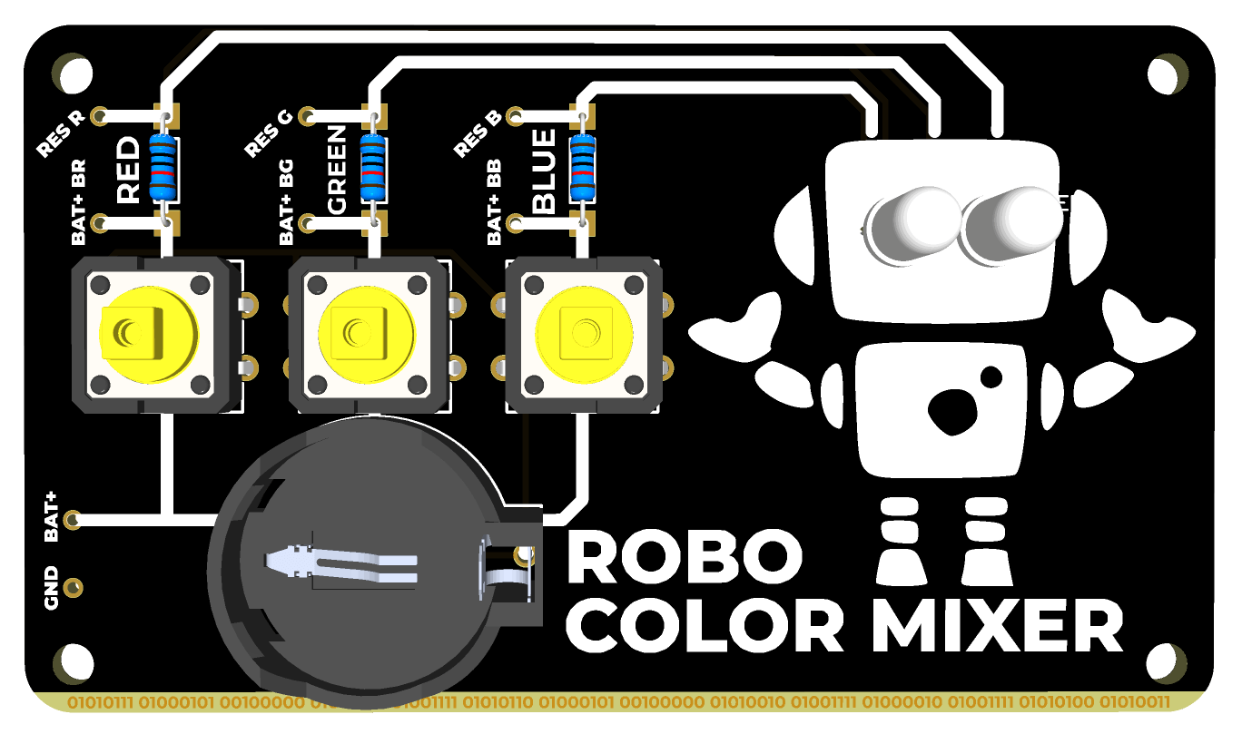 Introducing the Color Mixer DIY Soldering Kit - a super easy way to make cool colors with lights! This kit consists of two special RGB lights, three resistors, a case for a little CR2032 battery, and a special board designed by the team where everything goes exactly in place.