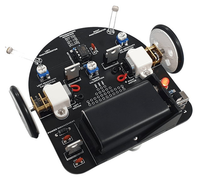 A set of carefully selected parts to build your light follower robot and an Attiny85 MCU that comes pre-programmed to do the job.