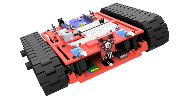 TANKBOT hosts an Arduino compatible micro-controller and a range of modules and sensors to make many combinations and help to create intelligent algorithms. It includes two infrared obstacle avoidance sensors, a light sensor, a humidity and temperature sensor, bluetooth, a buzzer/mini speaker, four general purpose switches and a strong 3W headlight. The best part is that it is designed to be easily expanded, disassembled and upgraded, thus leveraging the huge market of Arduino compatible modules and sensors that counts more than one hundred different parts!