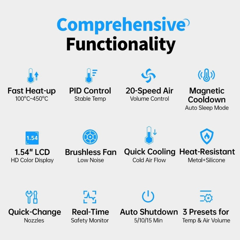 - ⚙️ Heat shrink tubing, paint removal, and general hot air applications.