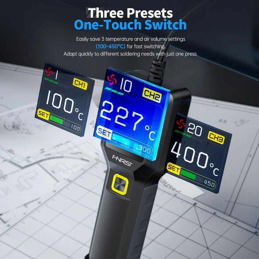 The FNIRSI SAG-55 Pro is a smart and powerful 550W hot air rework gun designed for precise soldering, desoldering, and electronics repair work. Equipped with advanced PID temperature control technology and a responsive 1.54″ LCD display, this Pro version offers professional level thermal stability and fast heating with minimal thermal shock, extending the life of the heating element and improving work quality.