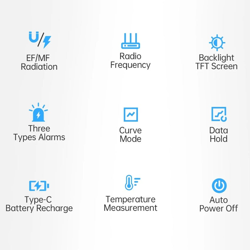 Equipped to measure electric fields, magnetic fields, RF power density, and ambient temperature, this 4-in-1 device also features adjustable alarm thresholds, data hold functionality, and a rechargeable battery via USB C, making it suitable for both everyday use and technical diagnostics.